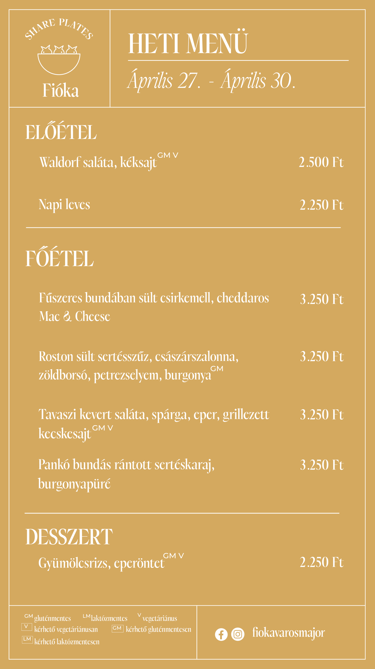 13 500 Ft(4 tányéros small plates válogatás a séftől, az aktuális összeállításról érdeklődj!)